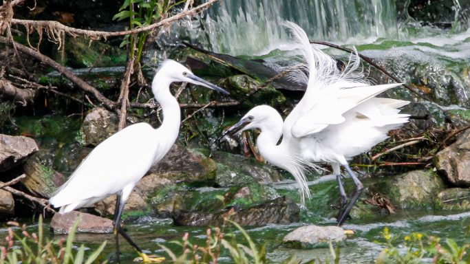 Two elegant little egrets clash by the waterfall, battling over a fish in a lively display of nature’s competition.