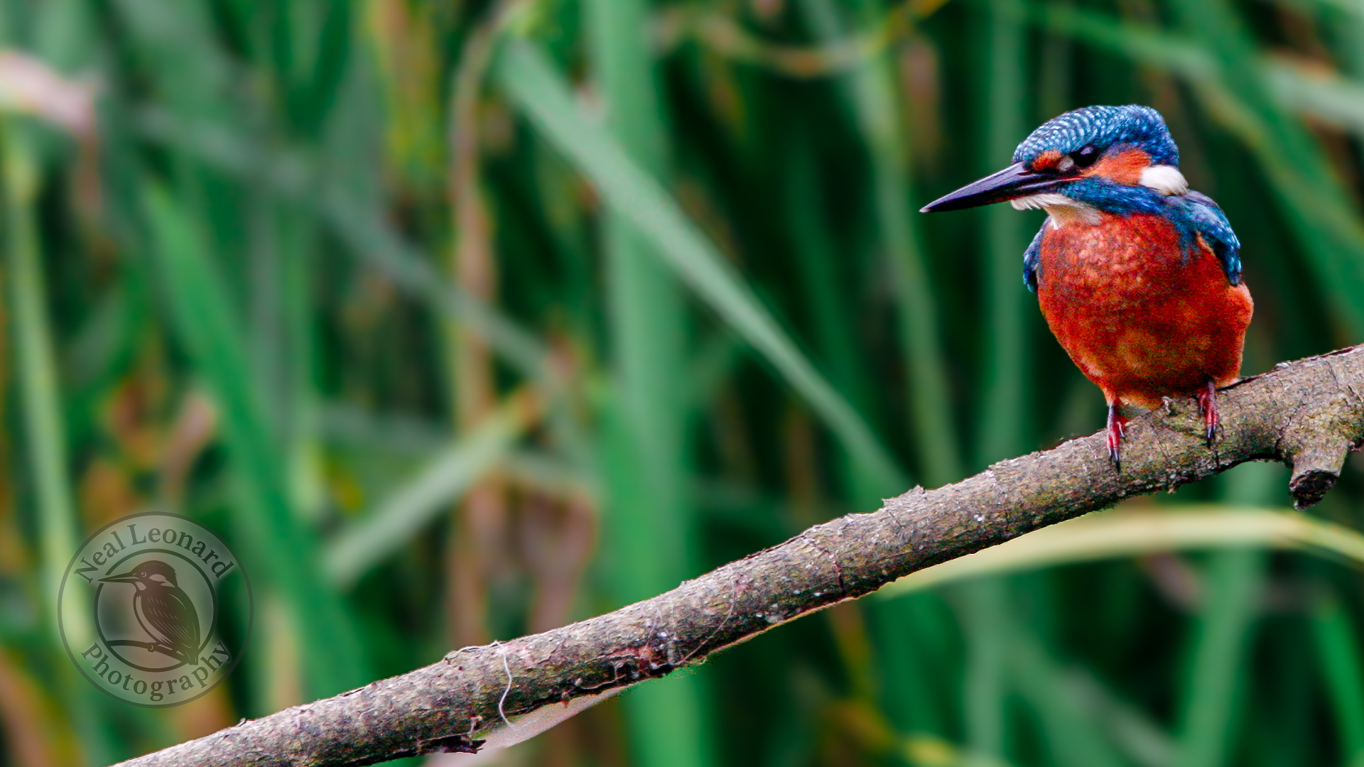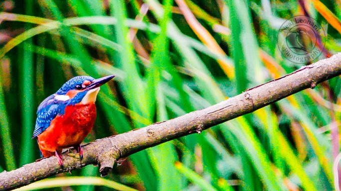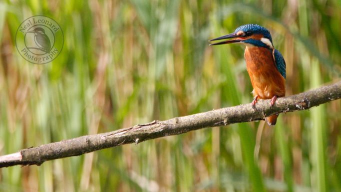 A Common Kingfisher perched on a branch, framed by vibrant green reeds at Brandon Marsh.