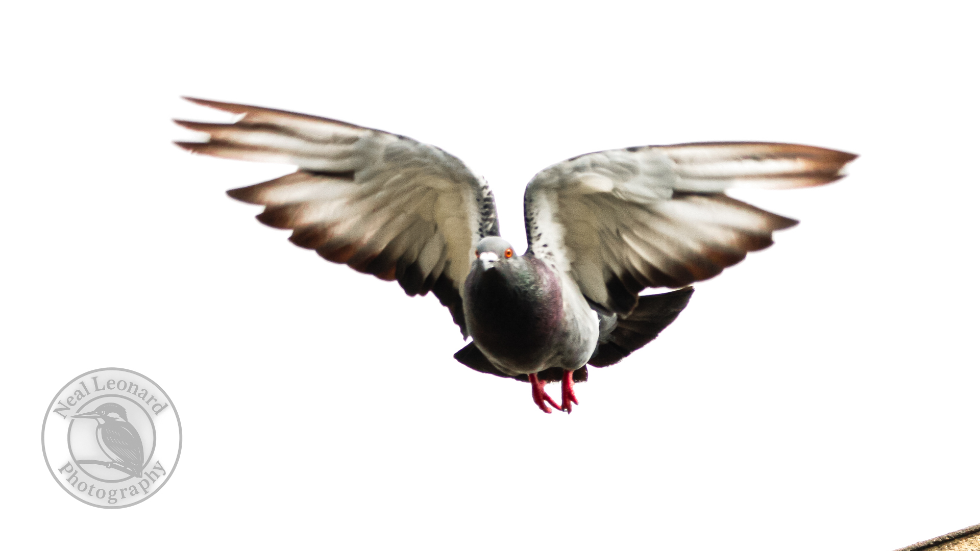 A feral pigeon soars above a rooftop, wings fully outstretched.