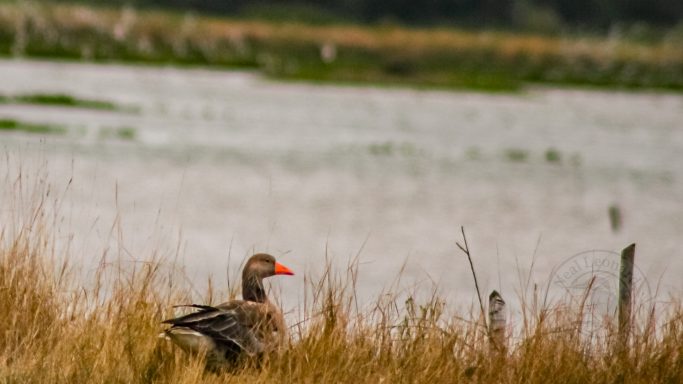 A solitary greylag goose its quietly in the tall grasses in a wetland at Fingrenhoe Wick
