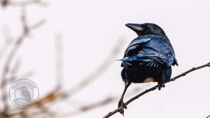 A Carrion Crow perched delicately on a thin branch at Brandon Marsh, its dark plumage catching a beautiful blue sheen in the soft autumn lig