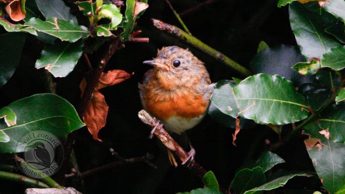 A juvenile robin rests among garden foliage, showing its developing red breast and speckled plumage.
