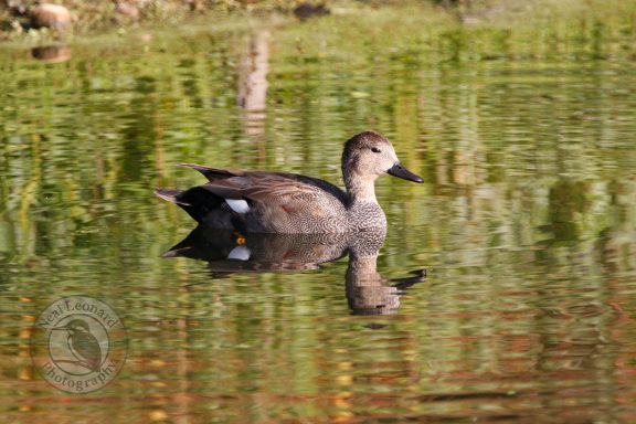 Gadwall drake at Brandon Marshes, gliding on still water in golden sunrise light.