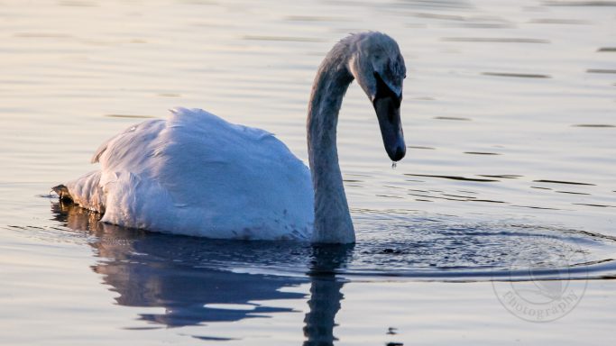 Mute Swan with muddy head bottom feeding in golden sunrise light at Brandon Marshes.