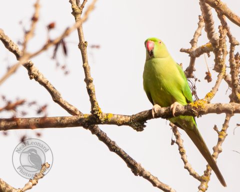 A vibrant Ring-necked Parakeet perched on a bare winter branch at Ladywalk, showing off its long tail and crisp green plumage.