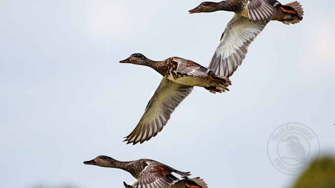 A group of Gadwalls in flight, wings spread against the soft sky at Rutland Waters