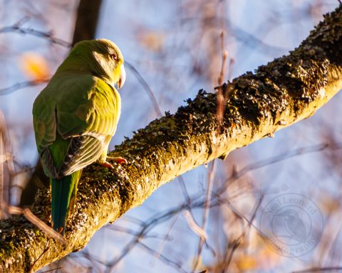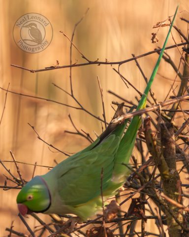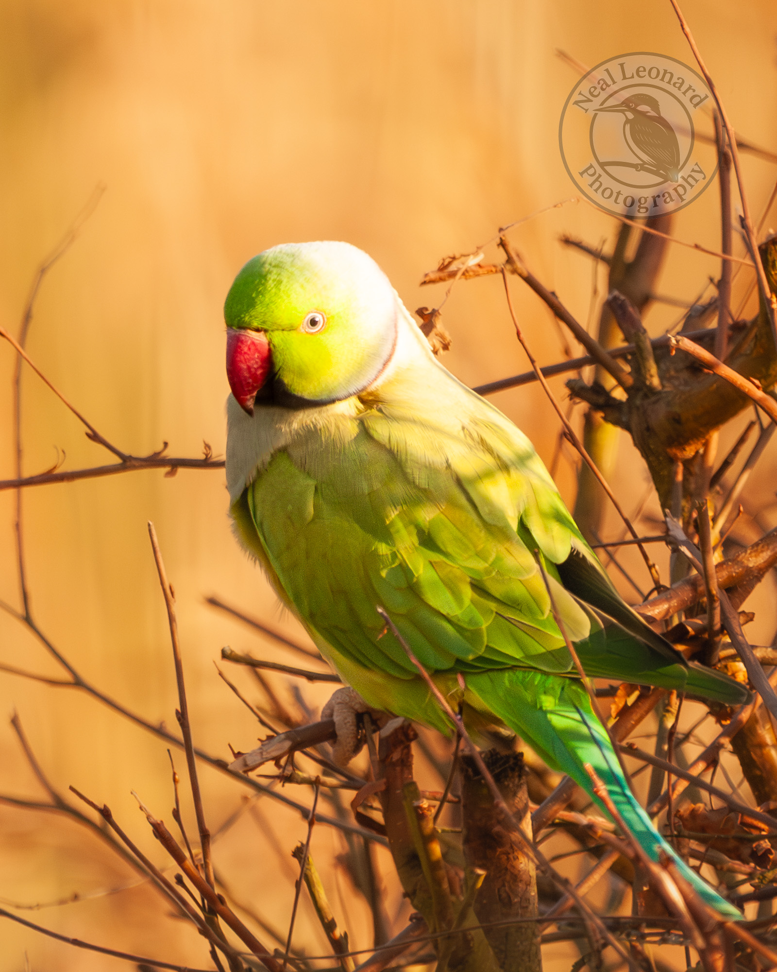 A bright Ring-necked Parakeet resting in warm golden light at Ladywalk. A clean, colourful portrait of this striking species.
