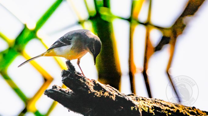 Grey Wagtail on a mossy branch searching for grubs at Brandon Marshes.