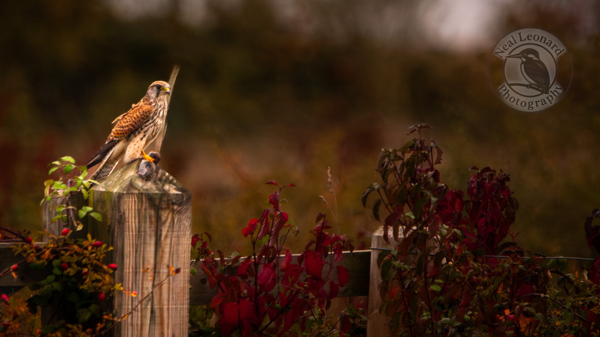 A Common Kestrel (Falco tinnunculus) rests on a wooden post at Abberton Reservoir, prey secured in its talons and lit by soft autumn tones.