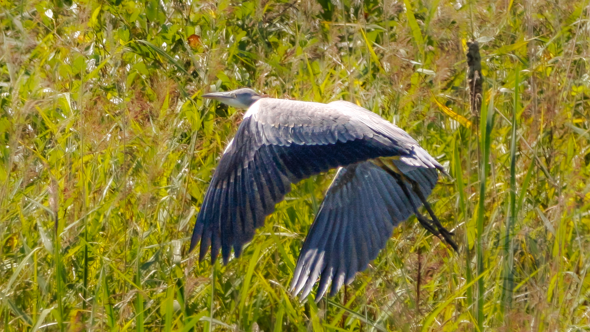 A graceful Grey Heron captured mid-flight over the reedbeds at Brandon Marsh. Its wide wingspan and sharp profile stand out.