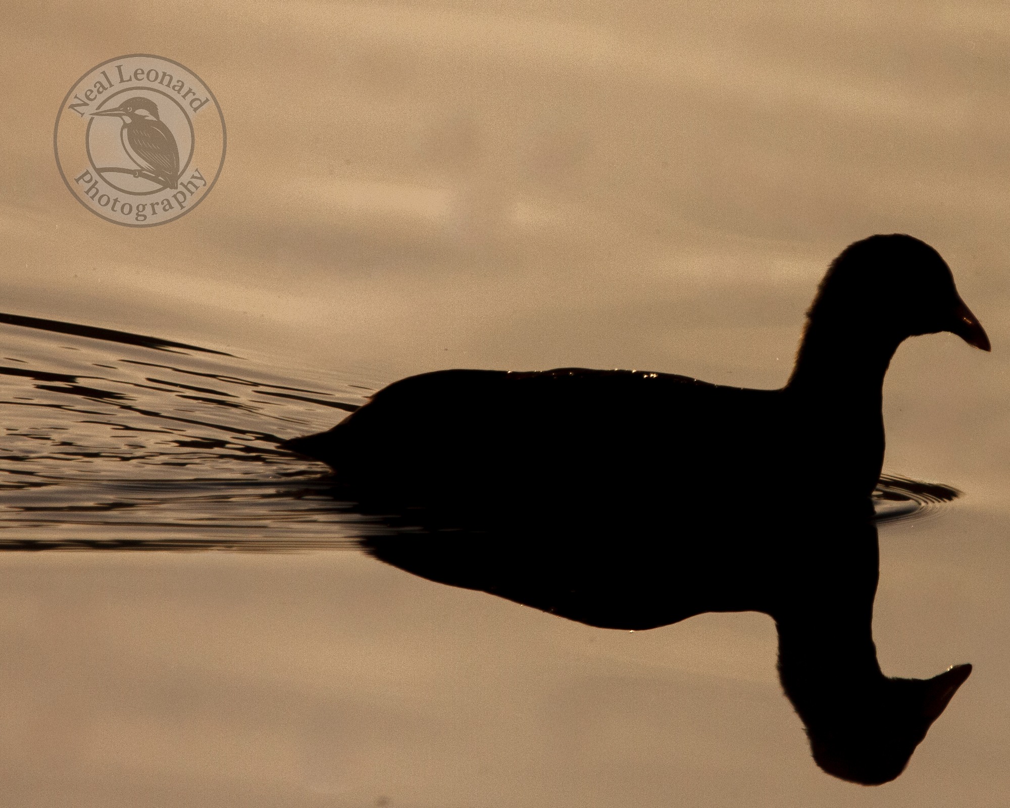 A striking silhouette of an Eurasian Coot gliding across calm waters, captured against the golden glow of sunrise.