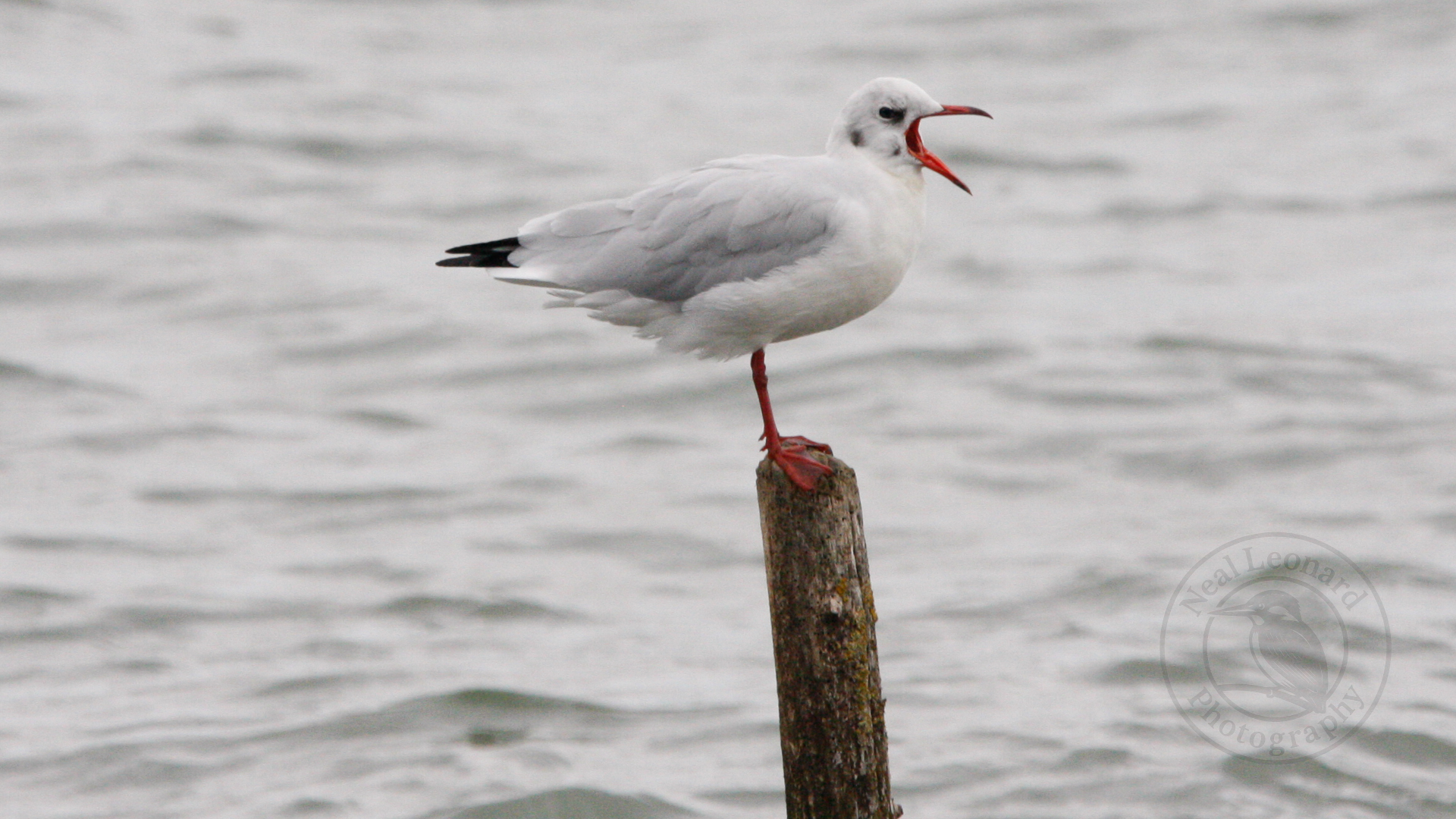 A black-headed gull perched on a post calls out across the water at Fingrenhoe Wick