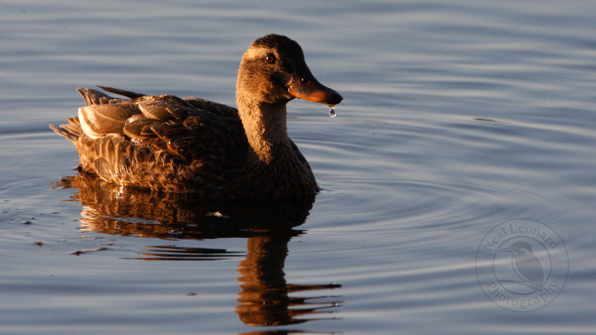 A Mallard Duck glides peacefully across calm water at Brandon Marsh,its reflection mirrored in the ripples. Water Drop dangles from its Beak
