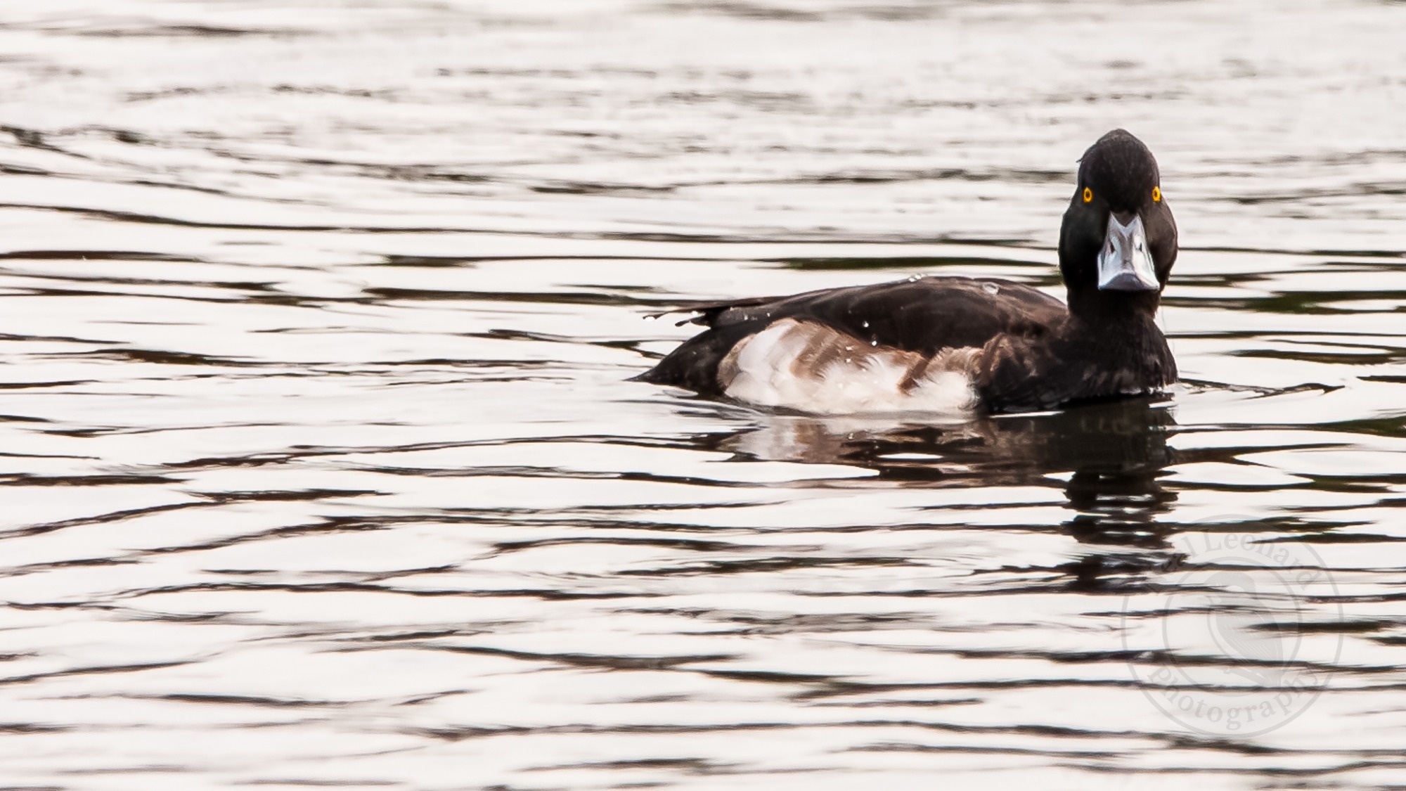 A male Tufted Duck at Brandon Marsh, its bright yellow eyes locked onto the lens as it drifts across calm water.