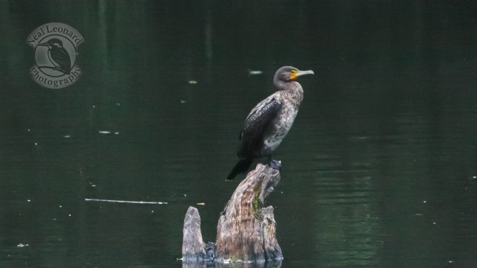 A great cormorant rests on a stump in the still waters of a quiet lake at Fingrinhoe Wick