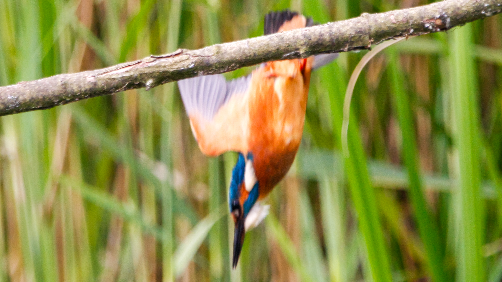 A Common Kingfisher (Alcedo atthis) rests on a branch at Brandon Marsh, its vivid plumage standing out against the reeds.