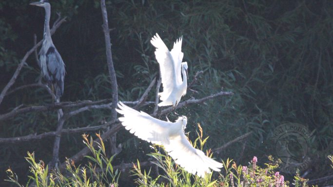 Little Egrets battling mid-air for territory at Brandon Marshes.