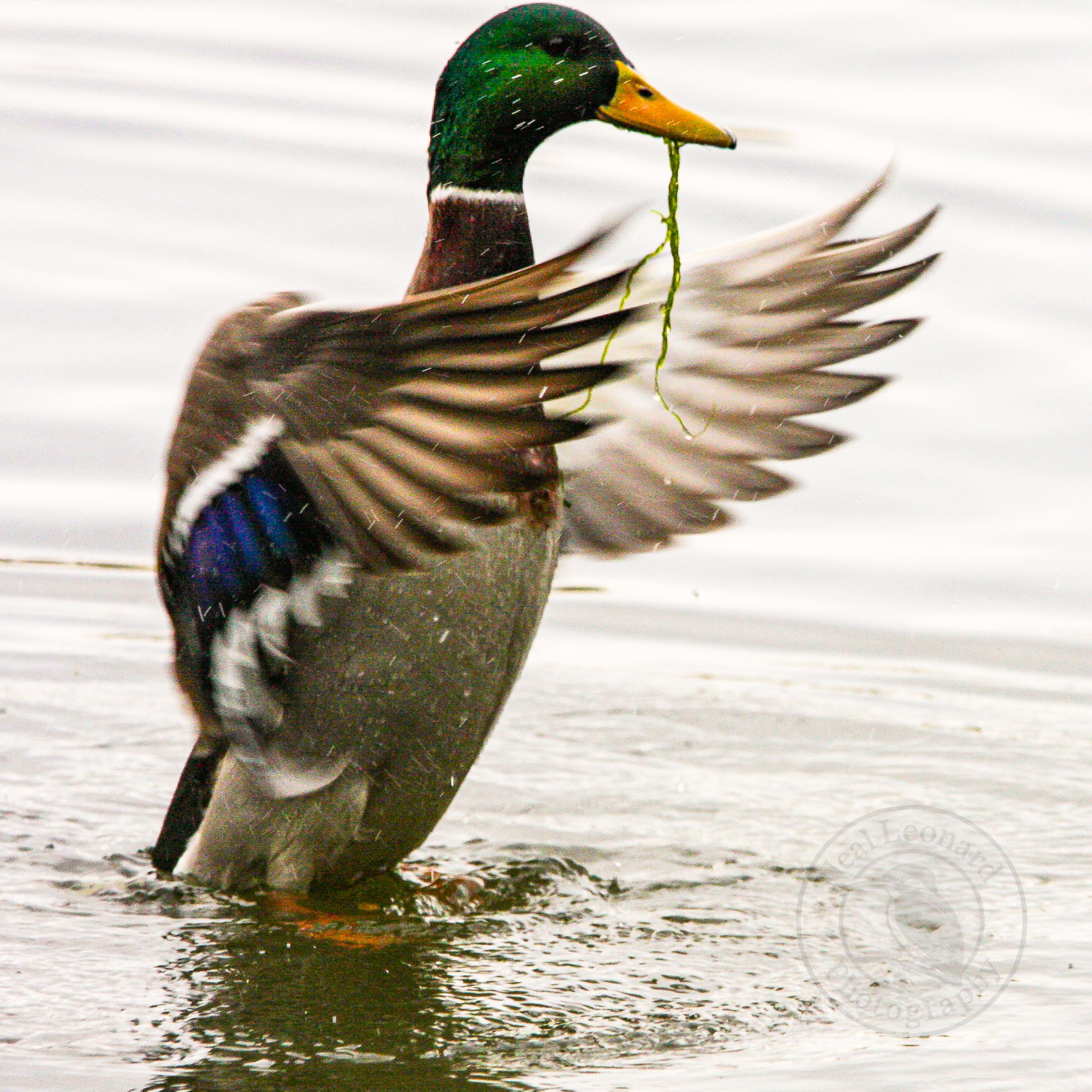 A male Mallard (Anas platyrhynchos) shakes off water at Brandon Marsh, wings beating rapidly with a strand of weed hanging from its bill.