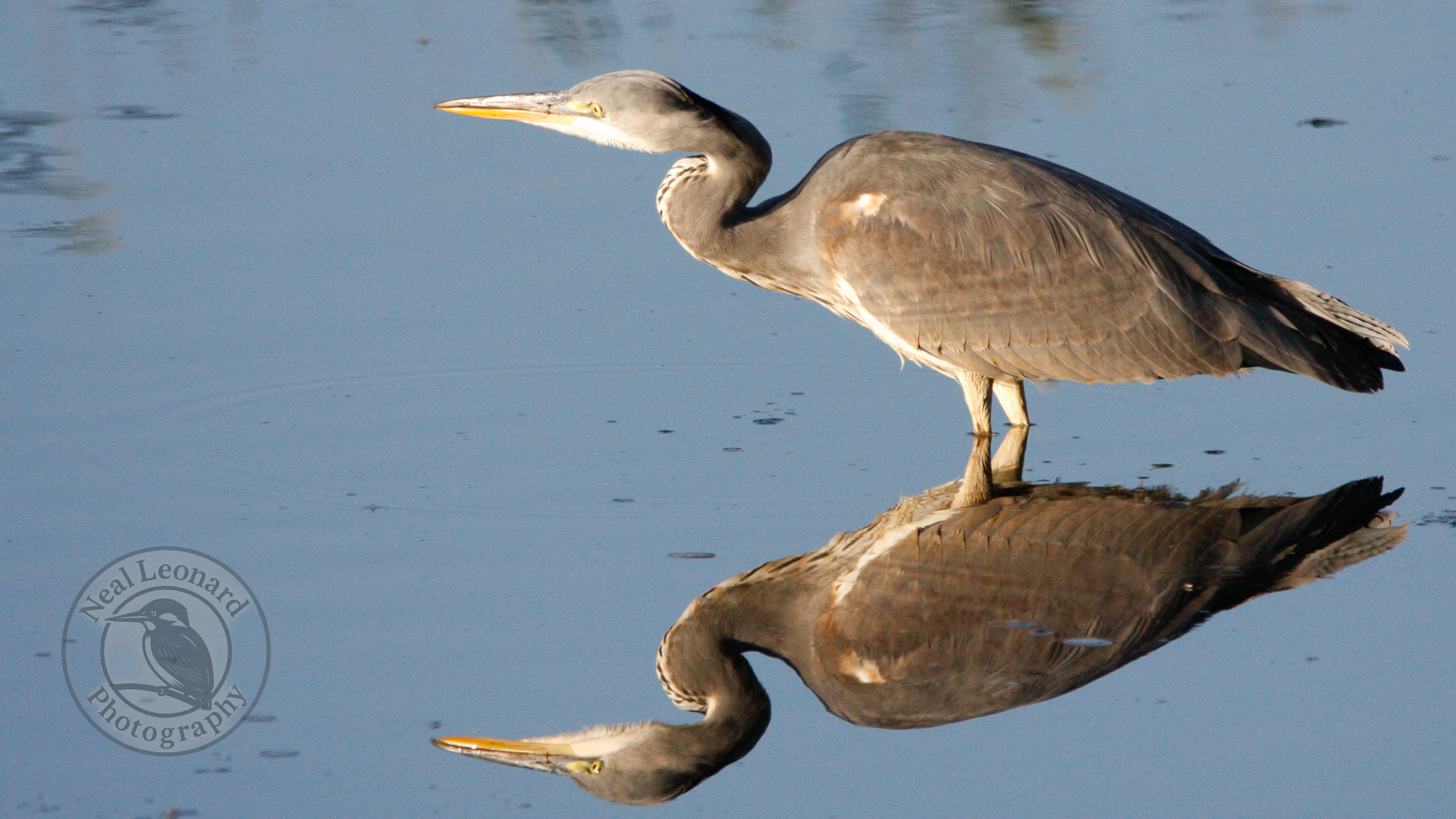 Grey Heron reflected in still waters at Brandon Marshes Nature Reserve.